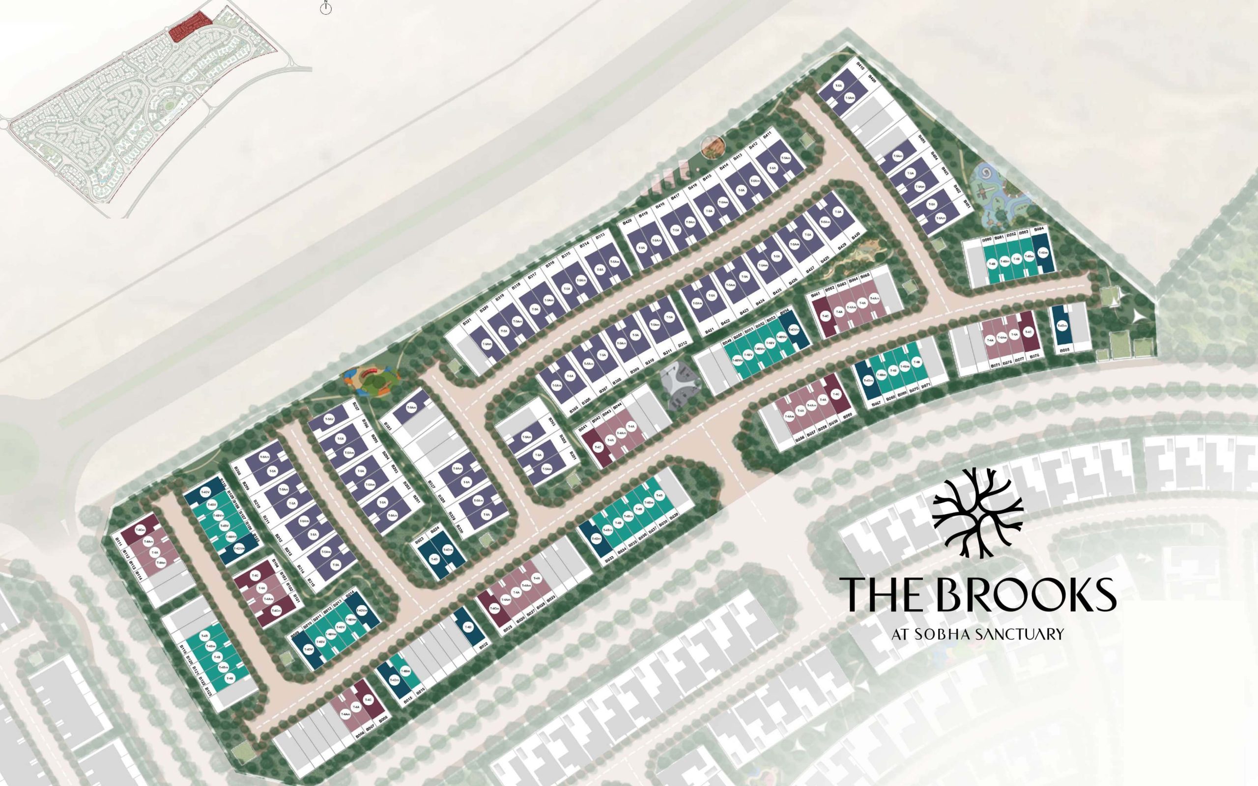The location of The Brooks cluster offers direct access to the central green spine and places nature at the heart of daily movement, creating a calm and continuous landscape that flows through the community. Homes are within easy walking distance of the district park, wellness center, community mall, and sports grounds, connected by cycling and walking networks and gently buffered from surrounding roads by masterfully layered landscaping.
