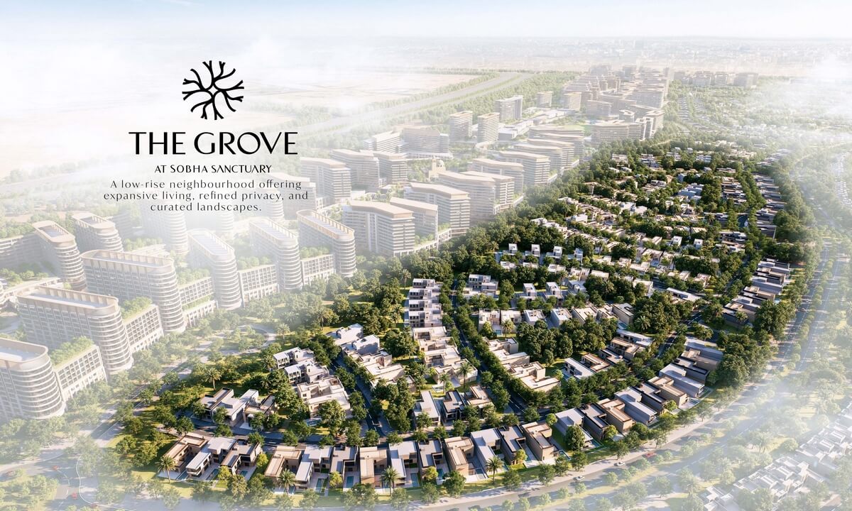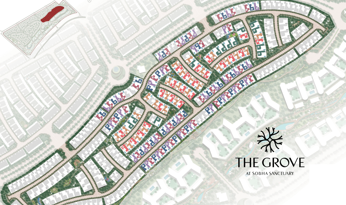 The location of The Grove cluster is embedded within Sobha Sanctuary’s blue-green network, where landscaped and linear parks shape daily movement and create a calm, flowing environment across the community. Homes are linked directly to cycling paths and pedestrian routes, a short walk from neighborhood amenities, and gently set apart from main activity zones through layered landscape buffers that preserve privacy and quiet living.