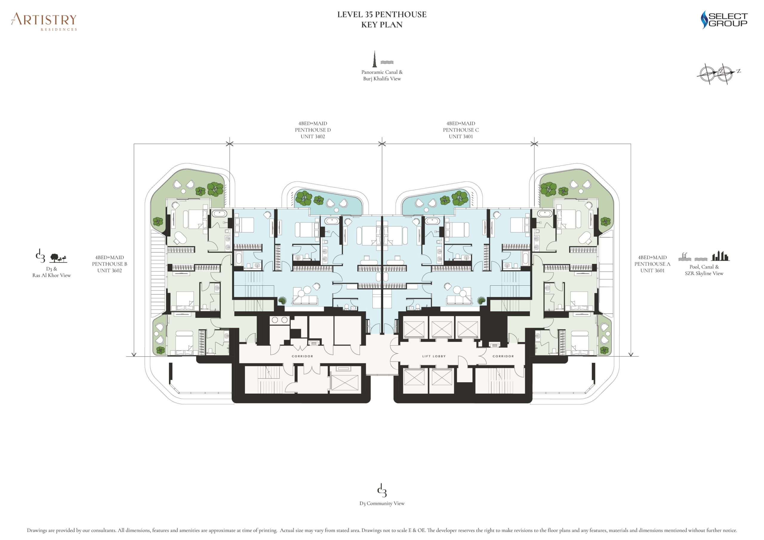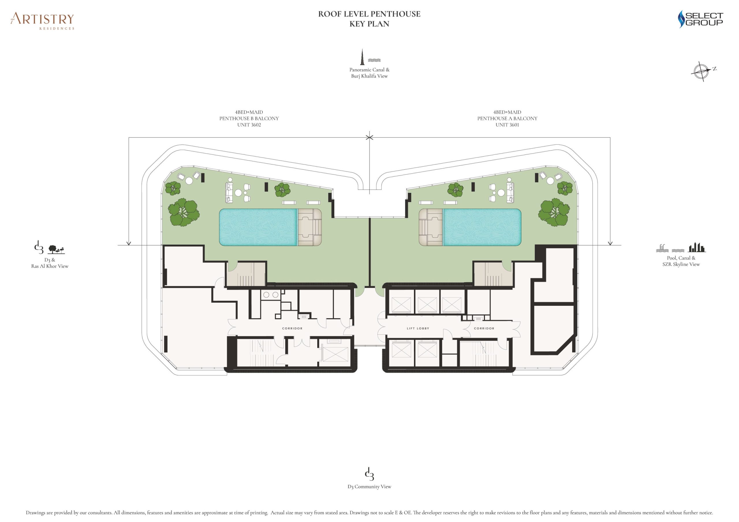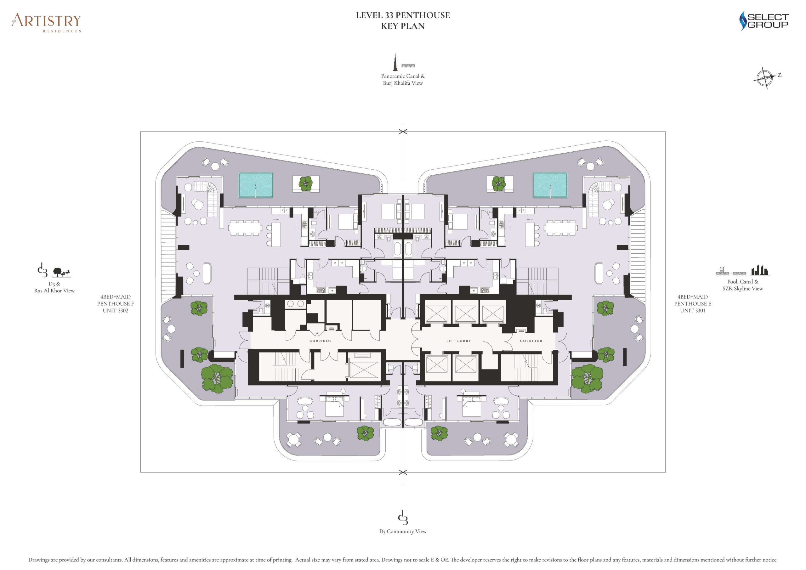 Located on the top levels, the duplex penthouses range from 4,638 to 7,765 sq. ft. and open onto generous terraces with private plunge pools, dual access points, and uninterrupted views across the city skyline.