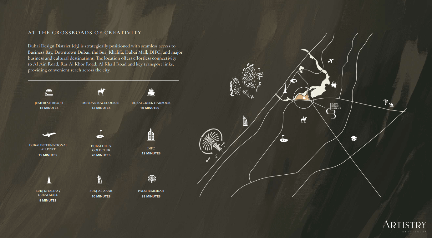 Dubai Design District (d3) is strategically positioned with seamless access to Business Bay, Downtown Dubai, the Burj Khalifa, Dubai Mall, DIFC, and major business and cultural destinations. The location offers effortless connectivity to Al Ain Road, Ras Al Khor Road, Al Khail Road and key transport links, providing convenient reach across the city.