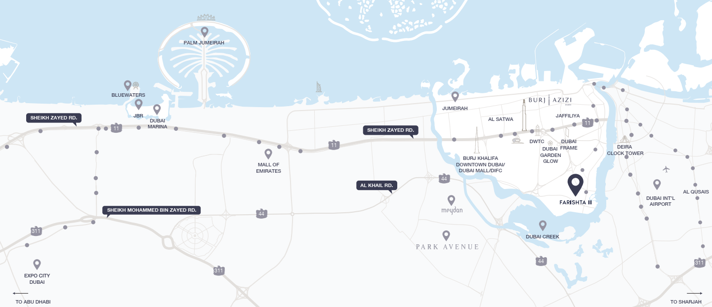 Azizi Farishta II is your launchpad into all that Dubai has to offer, with easy fast connectivity to the city’s premier landmarks: Al Jaddaf Waterfront is on your doorstep, and in just a few minutes you can reach the premier beaches, attractions of Downtown Dubai, and the runways of Dubai International Airport. With easy access to the Dubai Creek Metro Station, Sheikh Zayed Road and Al Khail Road, the city is yours for the exploration.