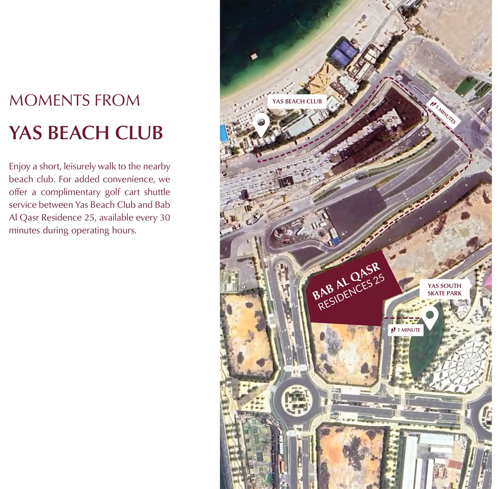 Enjoy a short, leisurely walk to the nearby beach club. For added convenience, we offer a complimentary golf cart shuttle service between Yas Beach Club and Bab Al Qasr Residence 25, available every 30 minutes during operating hours.