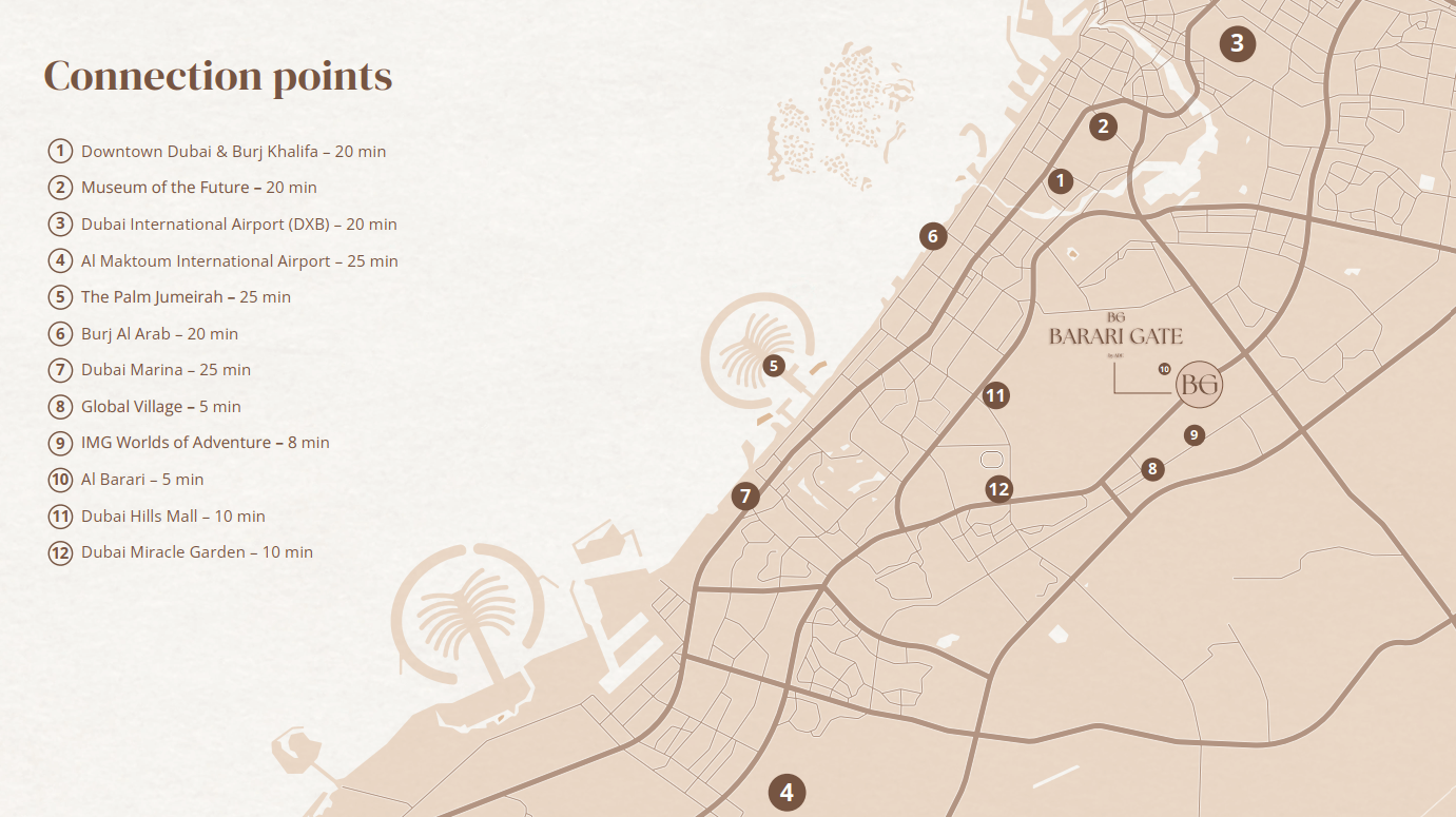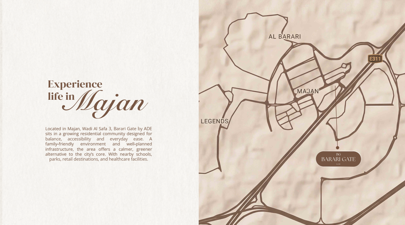 Located in Majan, Wadi Al Safa 3, Barari Gate by ADE sits in a growing residential community designed for balance, accessibility and everyday ease. A family-friendly environment and well-planned infrastructure, the area offers a calmer, greener alternative to the city’s core. With nearby schools, parks, retail destinations, and healthcare facilities.
