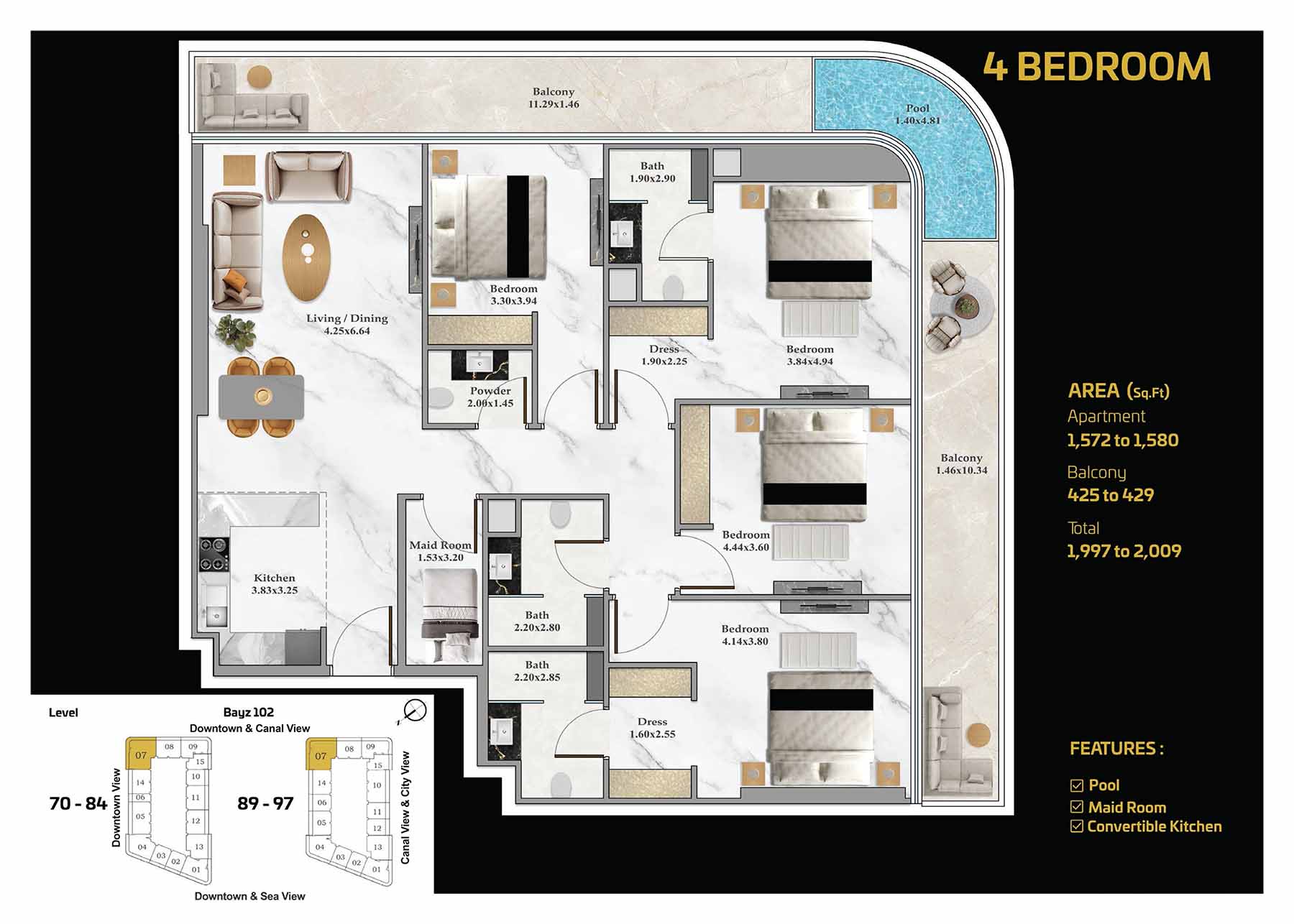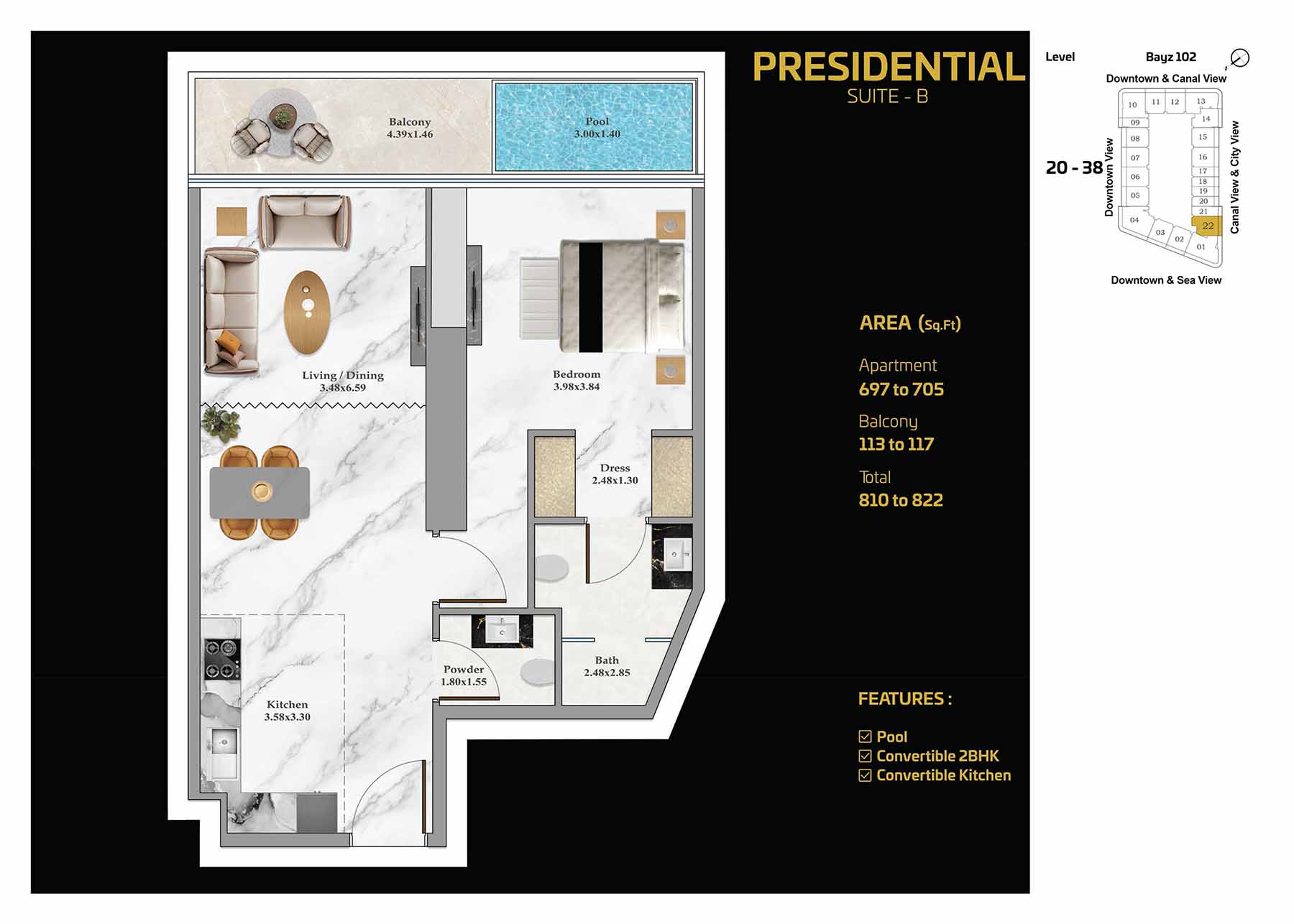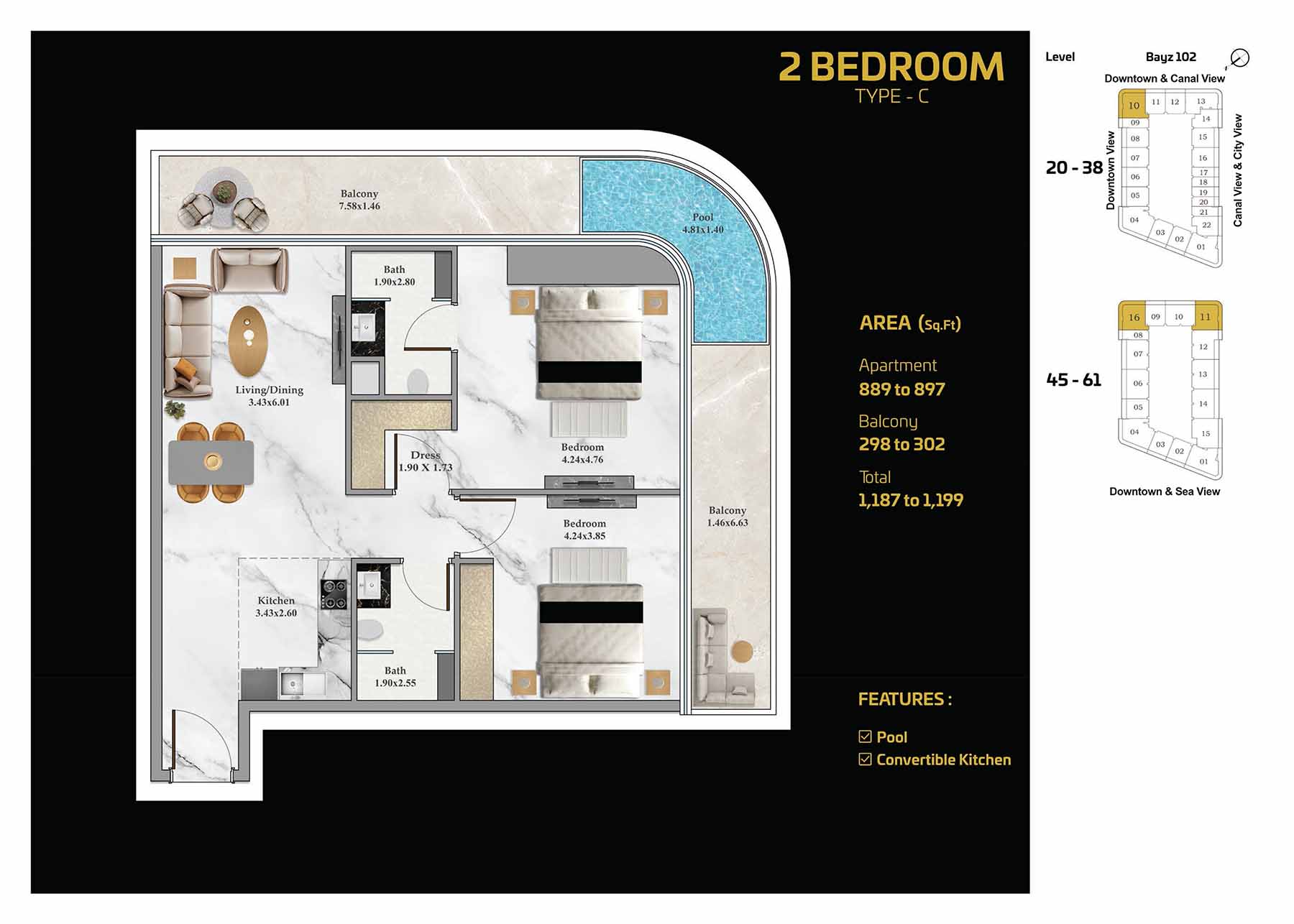 Set in the heart of Business Bay, distinguished by its high-rises, stylish apartments, corporate offices, and luxury hotels – BAYZ 102 stands tall as a landmark. Positioned in proximity to Sheikh Zayed Road and a mere three-minutes from the Business Bay metro station, you can enjoy world-class shopping, exquisite dining, and endless entertainment at your doorstep.