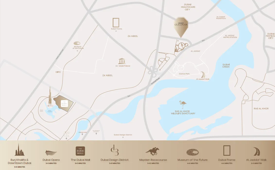 Cullinan enjoys a fitting location. The entire city is within seamless reach. Effortless accessibility is provided to major roads towards E11, Sheikh Zayed Road (SZR), and Al Khail Road. This ensures quick access to key destinations. Downtown Dubai and Burj Khalifa are approximately 5km away, so a 5 minute drive. Dubai International Airport (DXB) is easily accessible. This is the promise of superior living : proximity without compromise.