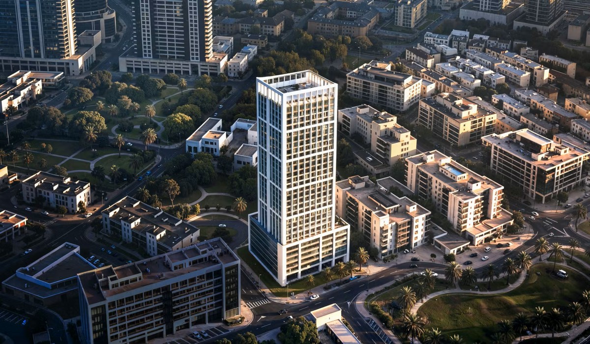 The tower is characterised by a unique exoskeleton and satin chrome finishes that provide natural shading. This structure maintains a glowing, iconic footprint at night, culminating in a structural crown. It is a form that breathes, blending sleek glass with the precision of a master-craf ted grid.