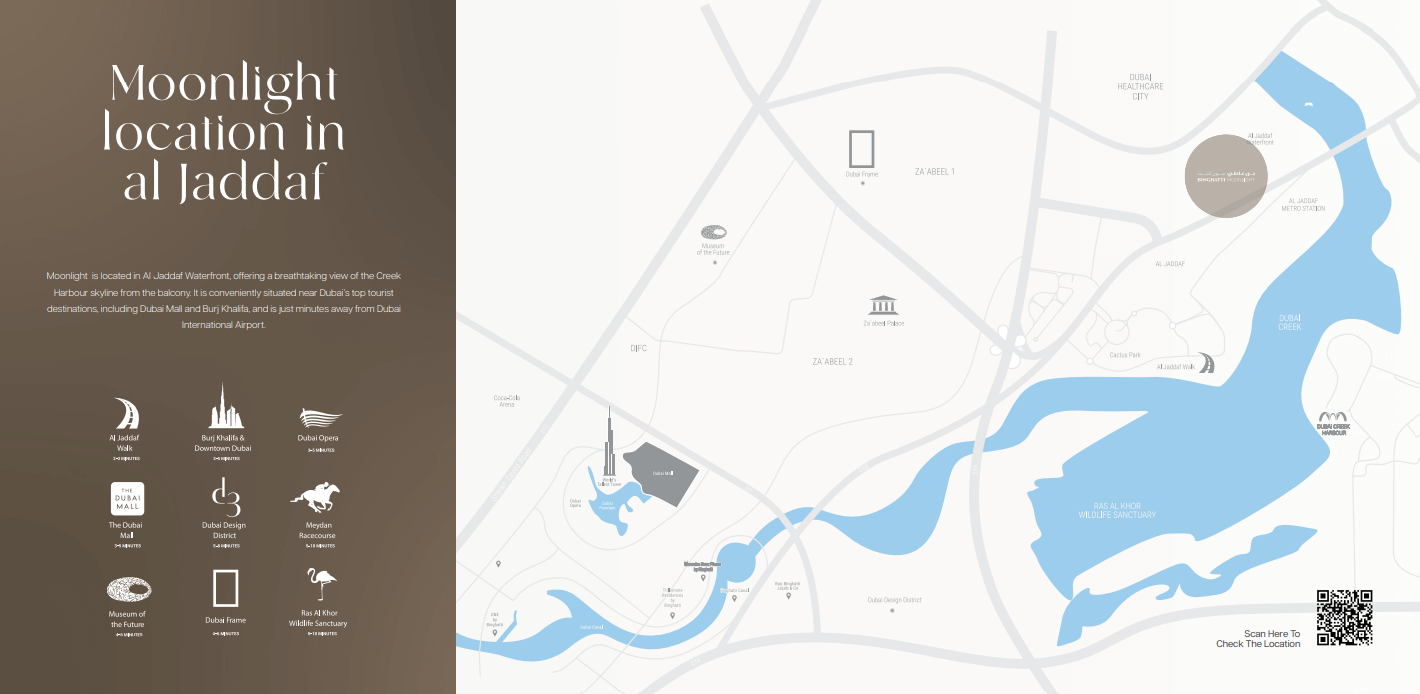 Moonlight is located in Al Jaddaf Waterfront, offering a breathtaking view of the Creek Harbour skyline from the balcony. It is conveniently situated near Dubai’s top tourist destinations, including Dubai Mall and Burj Khalifa, and is just minutes away from Dubai International Airport.