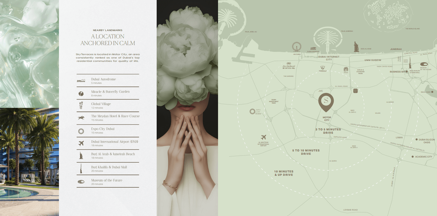 SkyTerraces is located in Motor City, an area consistently ranked as one of Dubai’s top residential communities for quality of life.