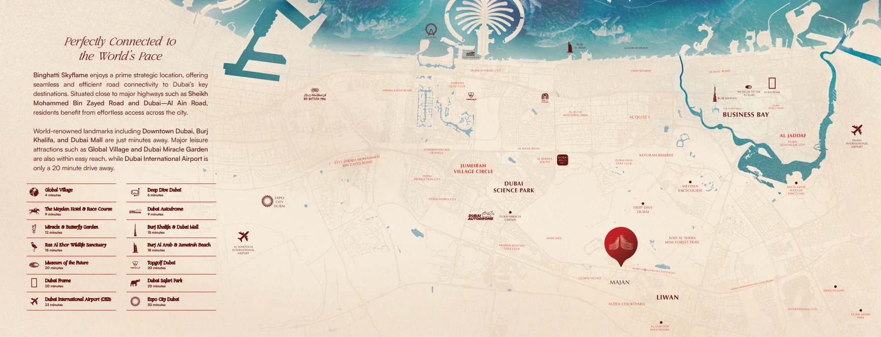 World-renowned landmarks including Downtown Dubai, Burj Khalifa, and Dubai Mall are just minutes away. Major leisure attractions such as Global Village and Dubai Miracle Garden are also within easy reach, while Dubai International Airport is only a 20 minute drive away.