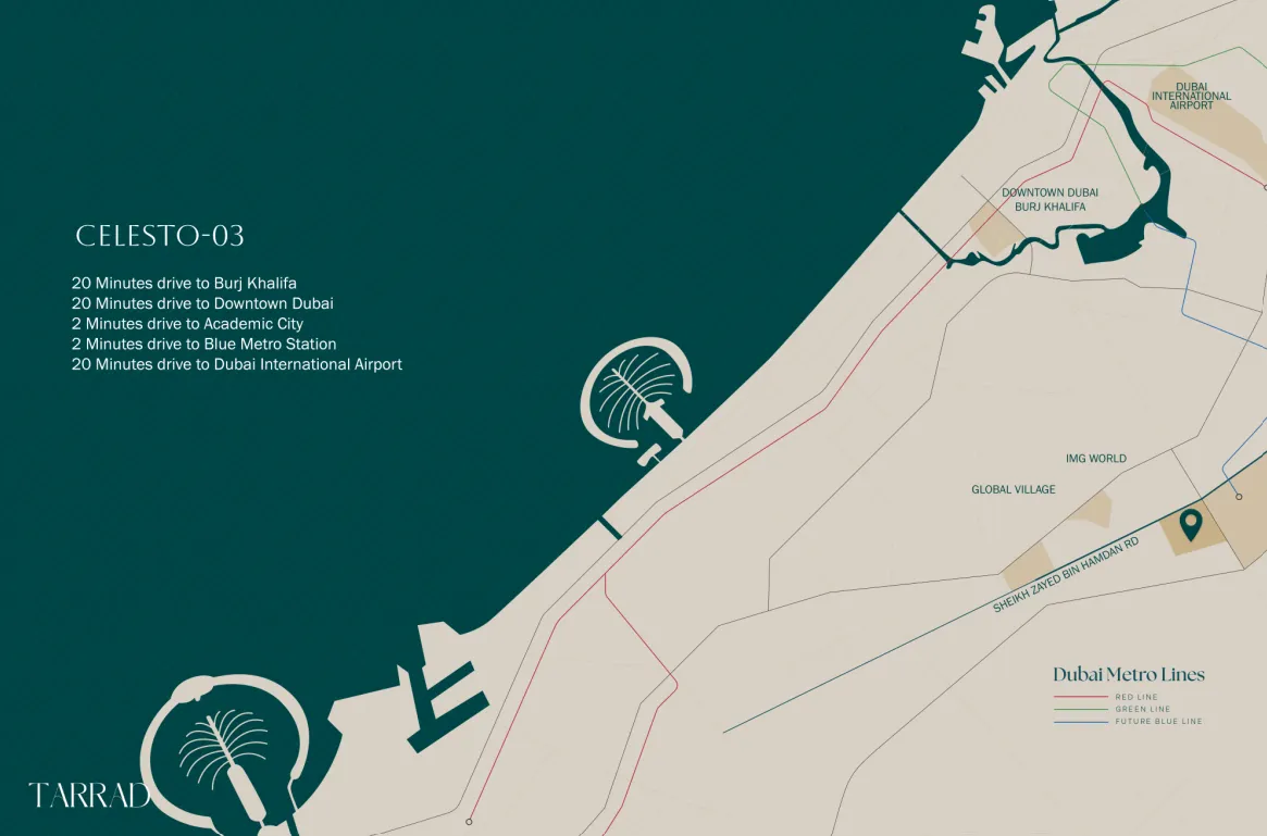 Embrace a lifestyle where tranquility meets exceptional connectivity. Ideally positioned just 20 minutes from Downtown Dubai and the iconic Burj Khalifa, and moments from Dubai International Airport, this address places the city’s finest experiences within easy reach.