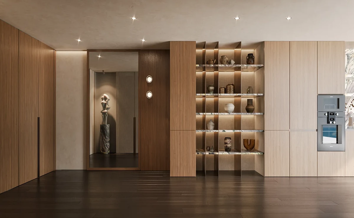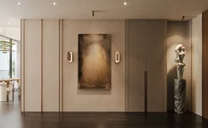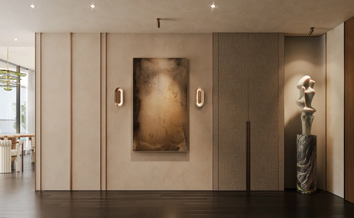 A carefully curated of materials defines the interiors, where marble surfaces introduce a refined presence and dark wood flooring grounds each space with depth and warmth. Ceramic accents add texture and contrast, while soft fabrics contribute to a tactile, inviting atmosphere. Wallpaper is used with intention, creating moments of emphasis and subtly framing different areas within the home.