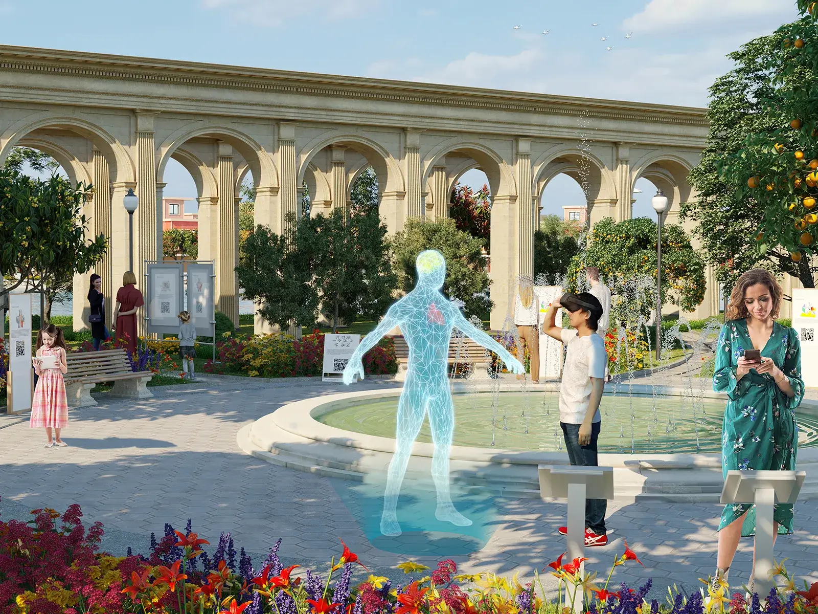 Step into a lush garden of learning with integrated QR codes, VR experiences, and digital screens offering captivating insights on a wide range of topics.