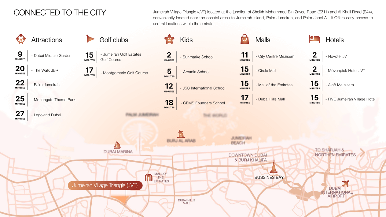 Jumeirah Village Triangle (JVT) located at the junction of Sheikh Mohammed Bin Zayed Road (E311) and Al Khail Road (E44), conveniently located near the coastal areas to Jumeirah Island, Palm Jumeirah, and Palm Jebel Ali. It Offers easy access to central locations within the emirate.