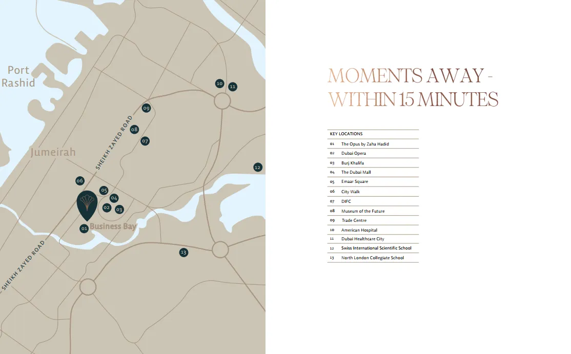 Ideally located in the heart of Business Bay, on the edge of Downtown, ELIRE offers effortless access to Dubai’s finest. From world-class dining, retail, and nightlife to parks, schools, and healthcare, everything is within reach. Explore cultural landmarks like Dubai Opera and Souk Al Bahar, or escape to the beaches, canal-side parks, and desert dunes just beyond.