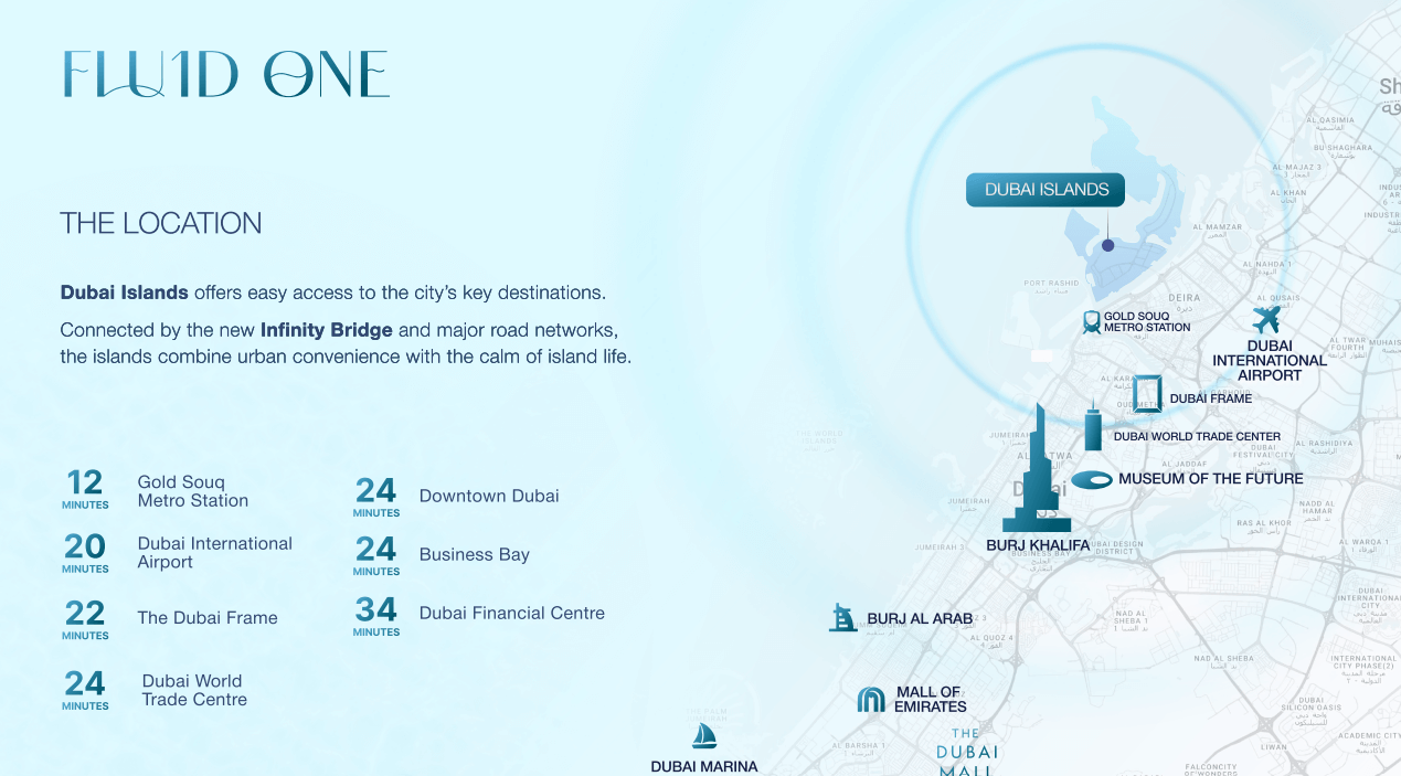 FLUID ONE is a new expression of coastal living in Dubai Islands, a destination shaped by water, open skies, and the ease of a resort-inspired district that remains seamlessly connected to the city.