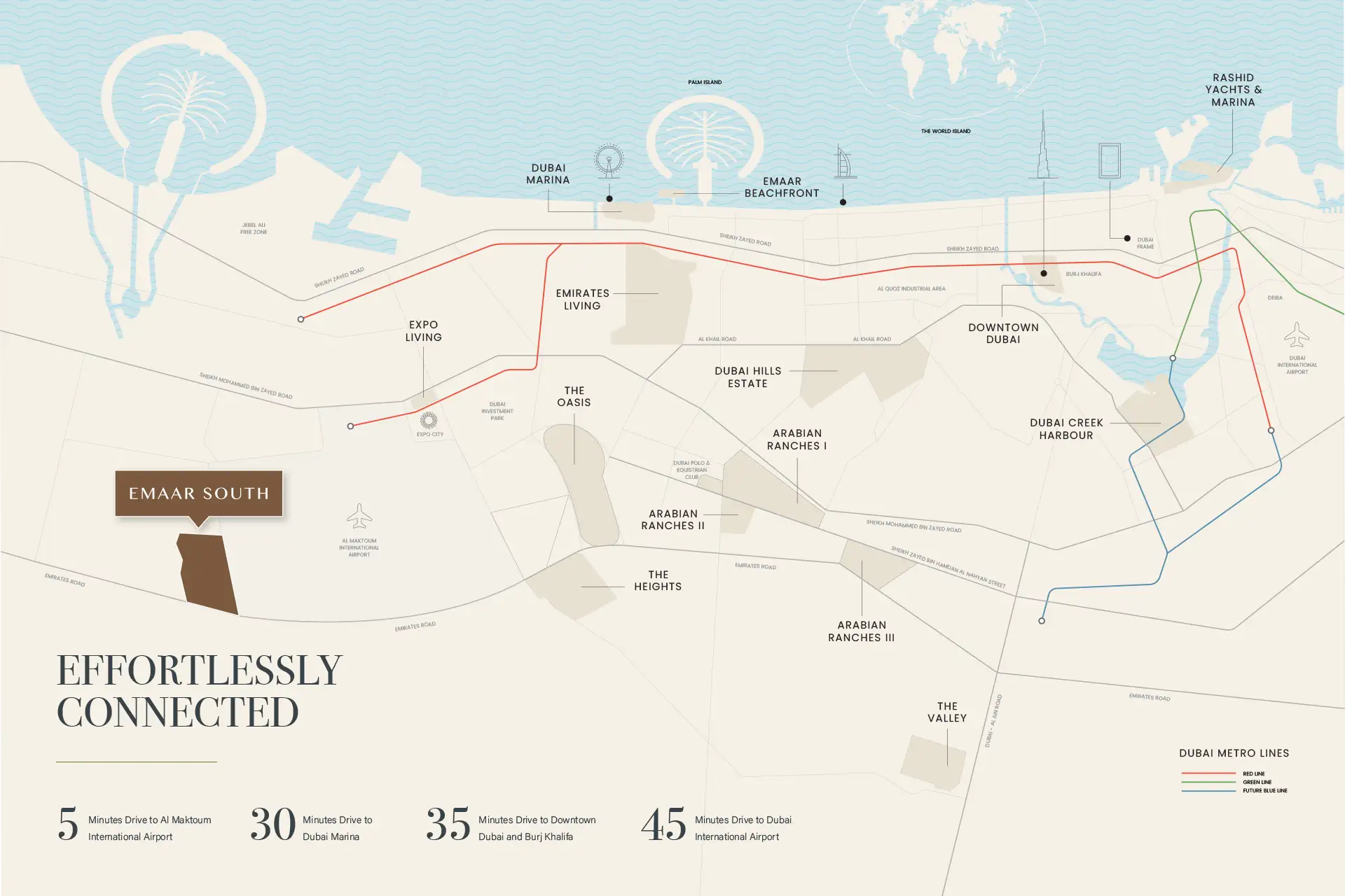 Connected Living with access to Al Maktoum International Airport, Dubai Marina, Downtown Dubai and Burj Khalifa, Dubai International Airport.
