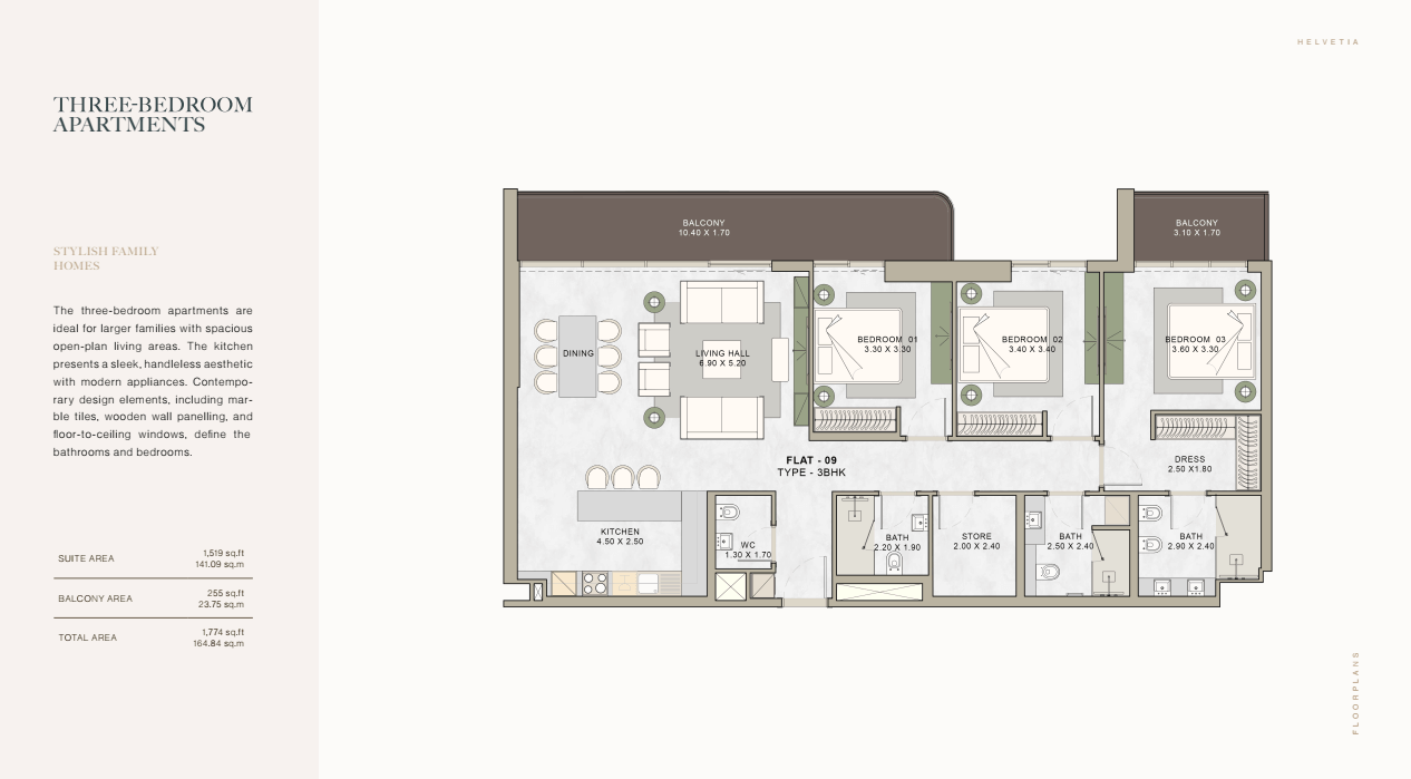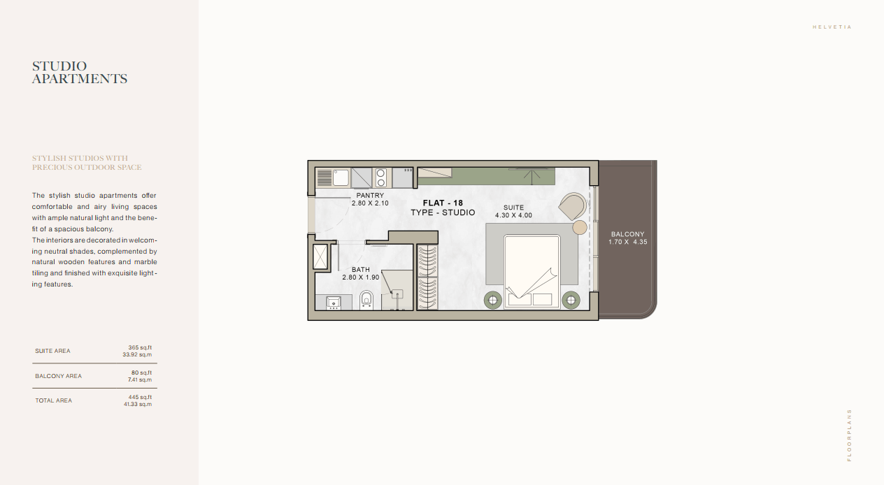 Helvetia Residences is DHG Properties’ inaugural residential development in Dubai. Its 430 apartments, ranging from studios to three-bedroom units, are crafted following Swiss-quality standards. Every residence reflects a commitment to smart design and premium materials.