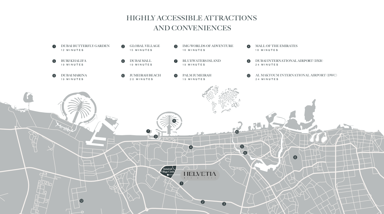 Jumeirah Village Circle is nestled in the heart of new Dubai. Conveniently located near renowned schools and less than 20 minutes by car to popular destinations, including Dubai Marina, Palm Jumeirah and Dubai Mall, this upscale community has an inviting village-like atmosphere and abundant green spaces.