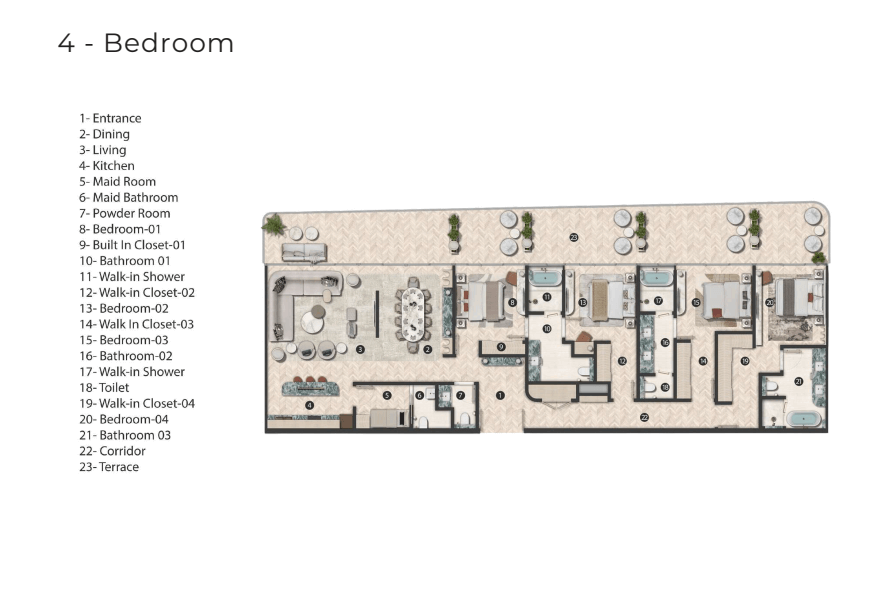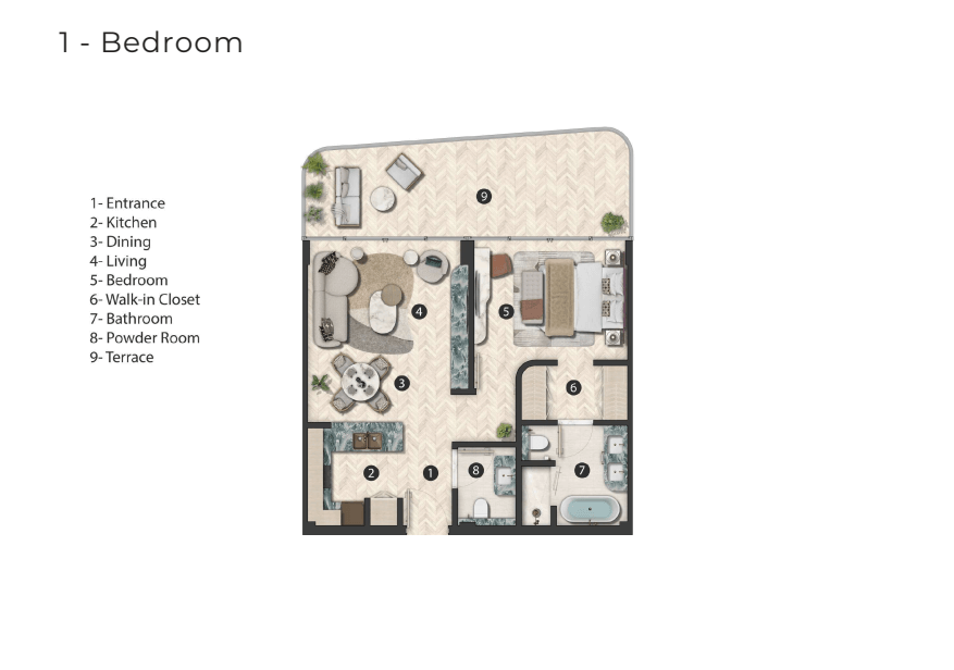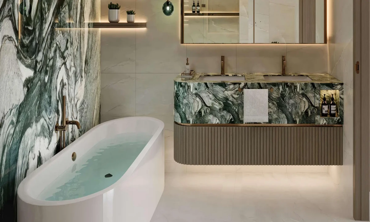 The interiors draw from the sensory richness of Abu Dhabi’s natural landscapes, from the muted greens of coastal waters to soft desert neutrals, grounded by earthen browns and energized by a bold crimson accent. The natural tones and tactile materials together create a harmonious blend of calm and contrast, evoking a lifestyle that is both rooted and refined. From the open-plan living and kitchen area to the intimate bedroom and bathroom retreat, each space is carefully curated to balance comfort, elegance and the tranquility of shoreline living.