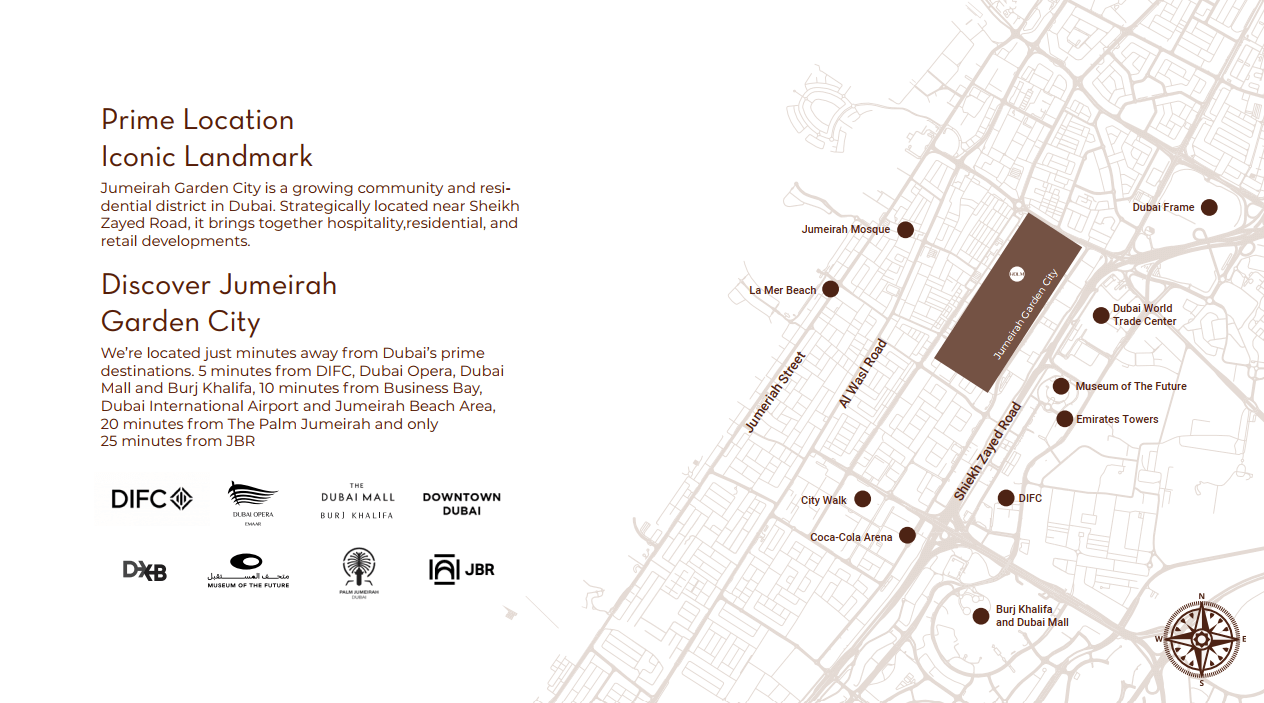 Jumeirah Garden City is a growing community and residential district in Dubai. Strategically located near Sheikh Zayed Road, it brings together hospitality, residential, and retail developments.