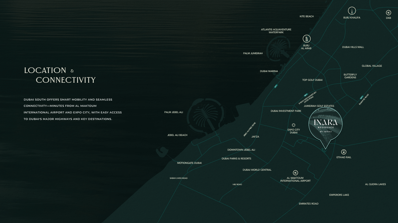 Dubai South offers smart mobility and effortless connectivity. Just minutes from Al Maktoum International Airport and Expo City, seamlessly linked to Dubai’s major highways, it places the city’s most important destinations within easy reach.
