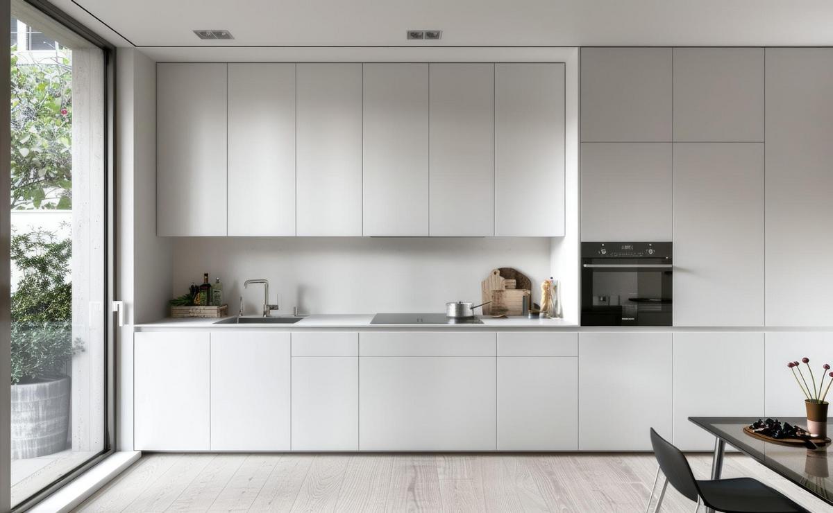 Modern and minimalist in design, the bedrooms feature a calm neutral palette of beige, brown, and cream tones. Floor to ceiling windows invite abundant natural light, creating a bright, airy atmosphere with a sense of comfort and understated elegance.