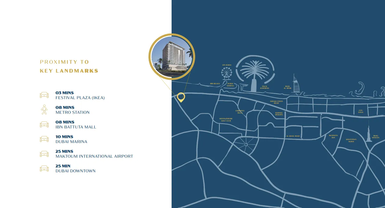 Strategically located in Wasl Gate along Sheikh Zayed Road, OMYA Residences offers seamless connectivity between Expo City Dubai and Jebel Ali. With direct metro access and close proximity to key destinations such as Jebel Ali Port, Al Maktoum International Airport, and major retail hubs, residents enjoy unmatched convenience. Surrounded by schools, healthcare facilities, and diverse cultural landmarks, the location perfectly balances accessibility, lifestyle, and everyday comfort.