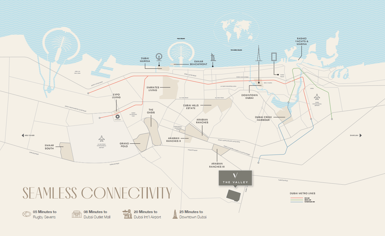 Enjoy seamless connectivity with direct access from Jebel Ali Lahbab Road, offering smooth links to Sheikh Zayed Road, Emirates Road, and key destinations such as Jebel Ali, JAFZA, Dubai South, DIP, and the Expo 2020 site. The location keeps you close to city essentials, with Rugby Sevens just 5 minutes away, Dubai Outlet Mall 8 minutes, Downtown Dubai 20 minutes, and Dubai International Airport 25 minutes. The community is shaped by nature, with gentle park horizons and lush greenery enriching daily life. Terrace Trails and a central park bring residents together, creating spaces for connection and a true sense of shared living.