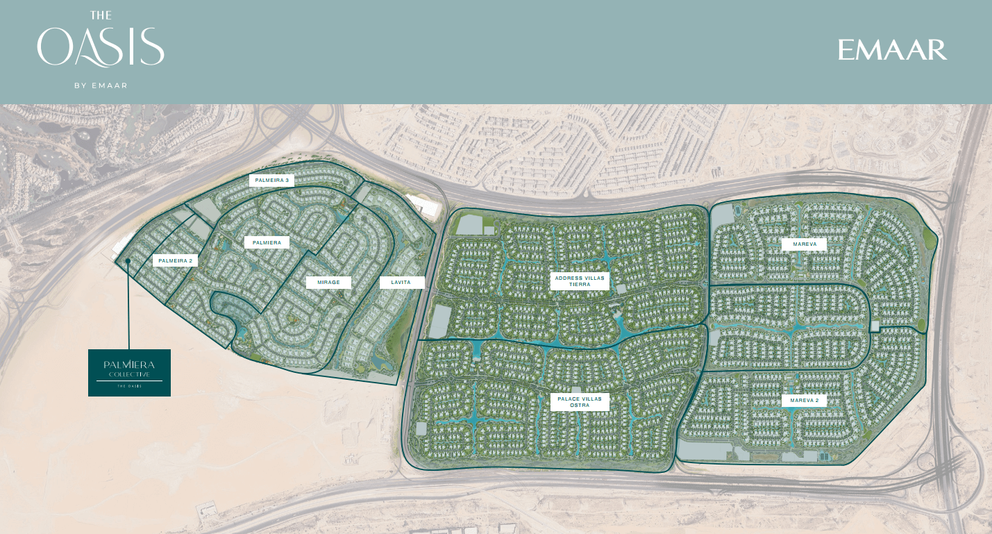 Palmiera Collective at The Oasis is ideally located within a prestigious master-planned community in Dubai, offering seamless connectivity to major road networks and key city destinations. Surrounded by tranquil landscapes and water features, the location combines peaceful living with convenient access to business hubs, retail, and lifestyle attractions.