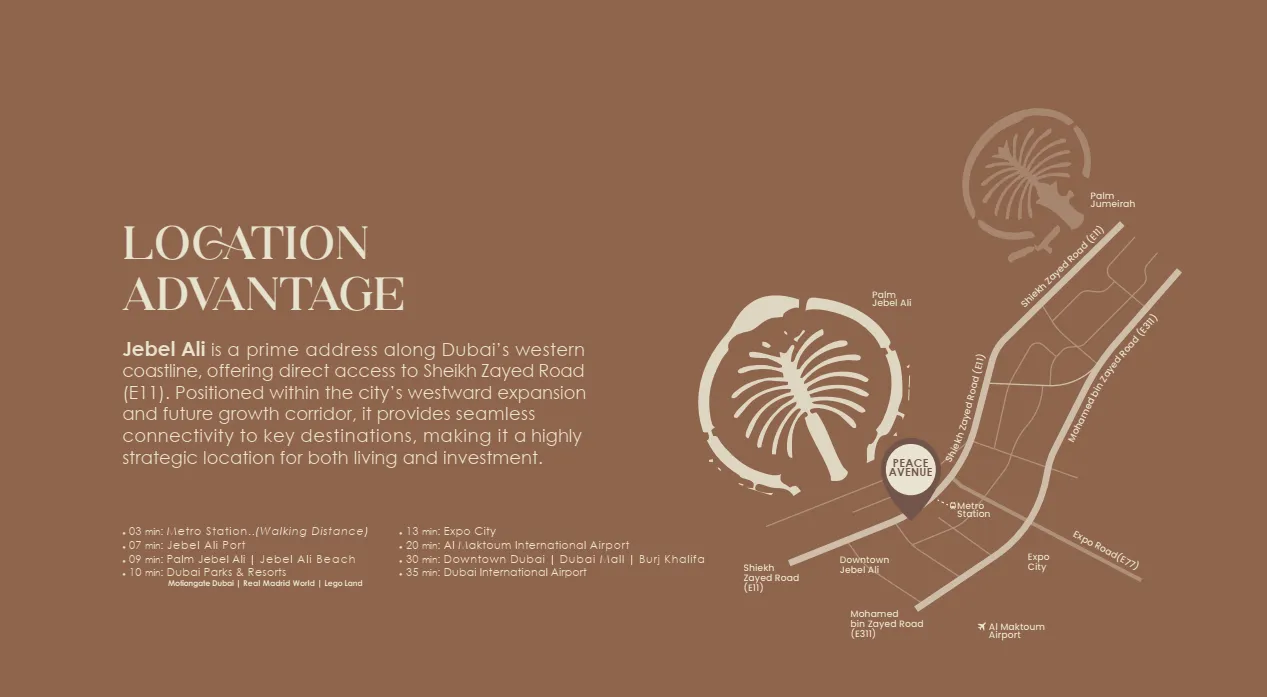 Jebel Ali is a prime address along Dubai’s western coastline, offering direct access to Sheikh Zayed Road (E11). Positioned within the city’s westward expansion and future growth corridor, it provides seamless connectivity to key destinations, making it a highly strategic location for both living and investment.