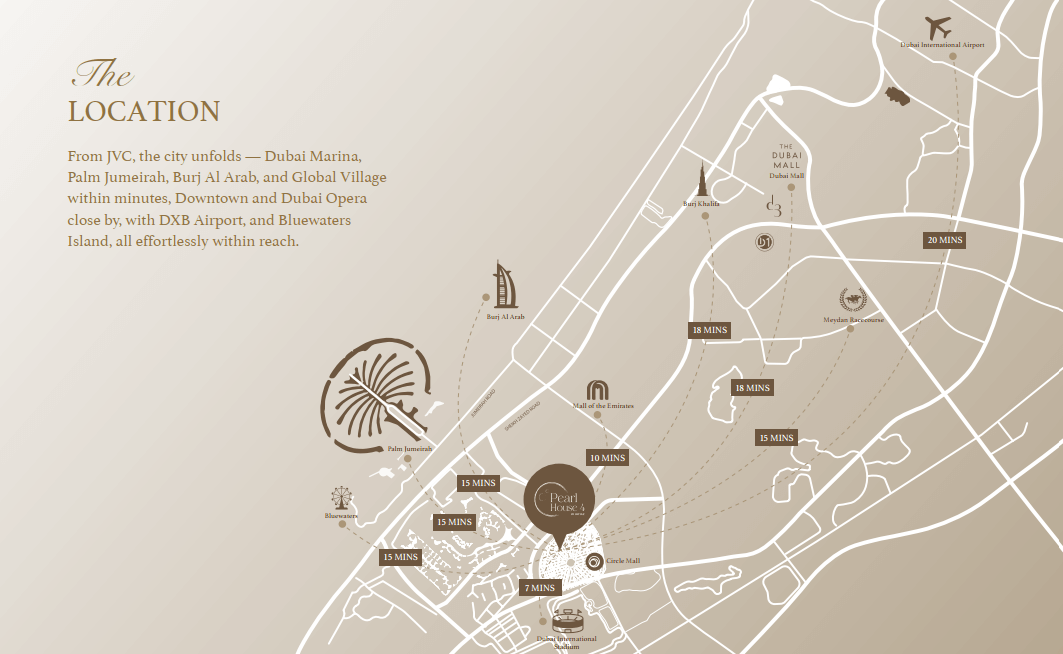 From JVC, the city unfolds — Dubai Marina, Palm Jumeirah, Burj Al Arab, and Global Village within minutes, Downtown and Dubai Opera close by, with DXB Airport, and Bluewaters Island, all effortlessly within reach.