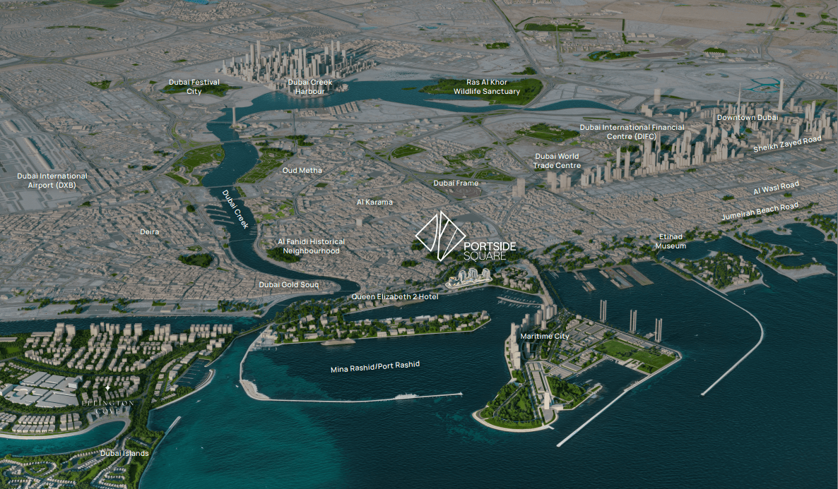 Set in the heart of Mina Rashid, Portside Square reimagines Dubai’s historic waterfront into a contemporary residential landmark. With distinctive residential towers, a dedicated business tower, and architecture inspired by the rhythms of the port and the sea, the development blends the legacy of the past with a bold vision for the future. Offering residences from sleek studios to expansive duplex apartments, Portside Square is defined by flowing design, thoughtful interiors, and panoramic views of the marina, skyline, and sea – creating a lifestyle where heritage and modernity converge.