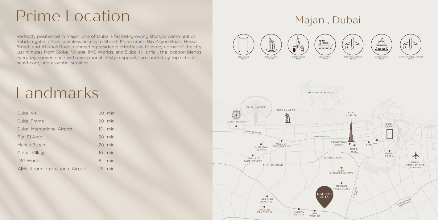 Strategically located in the heart of Majan, Dubai, Rabdan Gates offers residents seamless connectivity to the city’s most prestigious destinations. Whether for business, leisure, or lifestyle, everything is within easy reach. Positioned between Dubai’s iconic landmarks and vibrant communities, Rabdan Gates combines urban convenience with architectural elegance — making it a smart address for modern living and long-term investment.