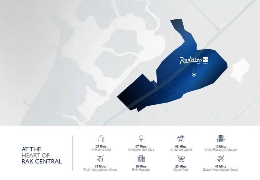 Located in RAK Central, Radisson Blu Residences places residents within a growing business and lifestyle hub with a live–work–play environment. The community offers easy access to major roads, Ras Al Khaimah International Airport, and Al Marjan Island, combining connectivity with a calm, well-planned urban setting.