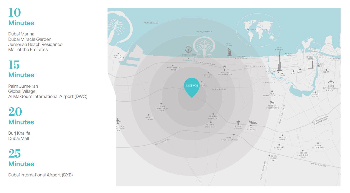 REEF 996 offers seamless connectivity from Dubai Production City. Its prime location provides direct access to major highways such as Sheikh Mohamed bin Zayed Road and Al Khail Road, ensuring smooth commutes to Dubai›s business districts, leisure destinations, and world-class entertainment like Mall of the Emirates and Dubai Marina.