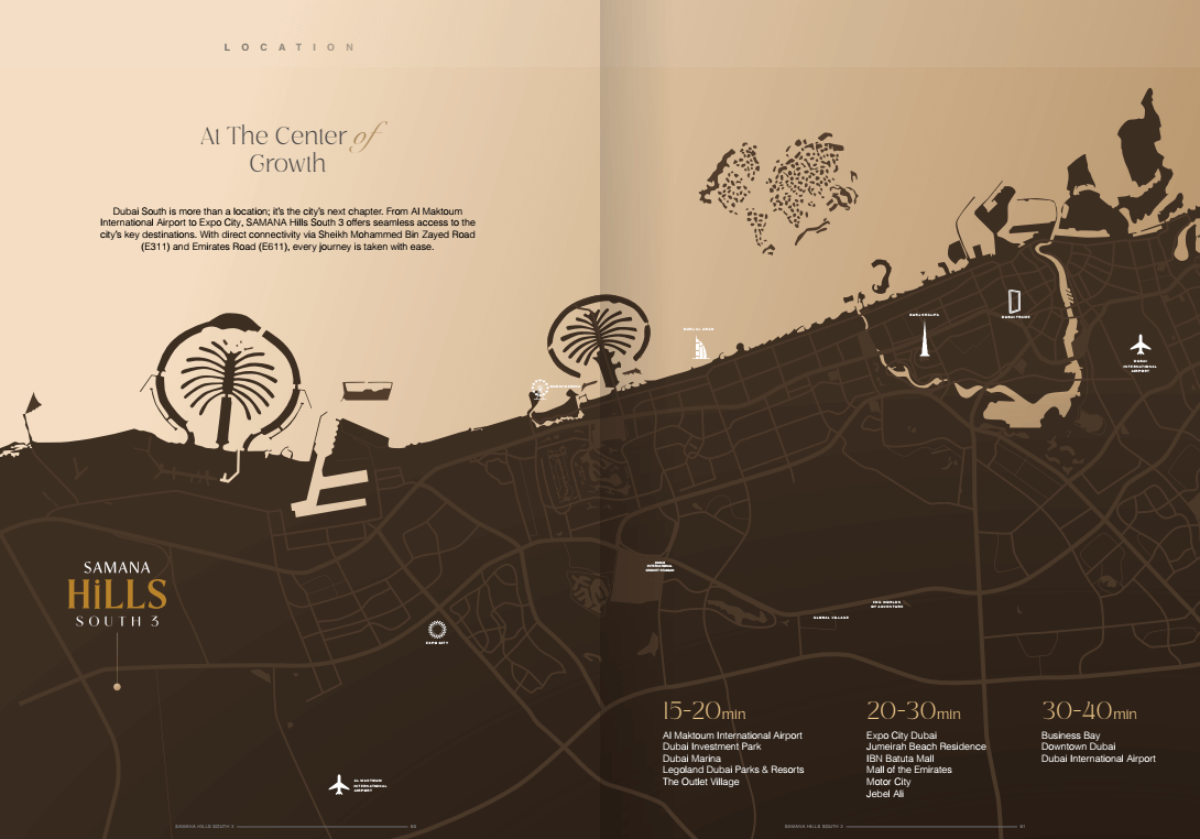 Dubai South is more than a location; it’s the city’s next chapter. From Al Maktoum International Airport to Expo City, SAMANA Hills South 3 offers seamless access to the city’s key destinations. With direct connectivity via Sheikh Mohammed Bin Zayed Road (E311) and Emirates Road (E611), every journey is taken with ease.
