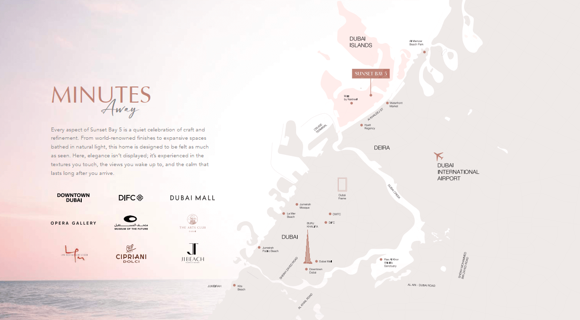 Offering 1–3 bedroom apartments, Sunset Bay 5 blends smart design with uninterrupted views, seamlessly connected to Dubai Islands’ coastal beauty. Well connected to the city’s heart, it combines the tranquility of island living with the convenience of urban access.