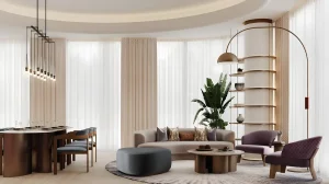 Taj Wellington Mews brings modern luxury to life through an Indian lens, uniting architectural precision with cultural soul. Expansive French windows flood each space with natural light, accentuating warm neutrals, jewel tones, and layered textures. A feature wall with vertical upholstery and metallic trims glows under recessed lighting, while touches of gold and brass add a refined opulence. Minimalist lines, spiritual undertones, and curated elements come together to craft a serene yet elevated retreat rooted in India’s artistic legacy