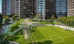 At the podium level, a lush urban park creates a vibrant setting for elevated lifestyle amenities.