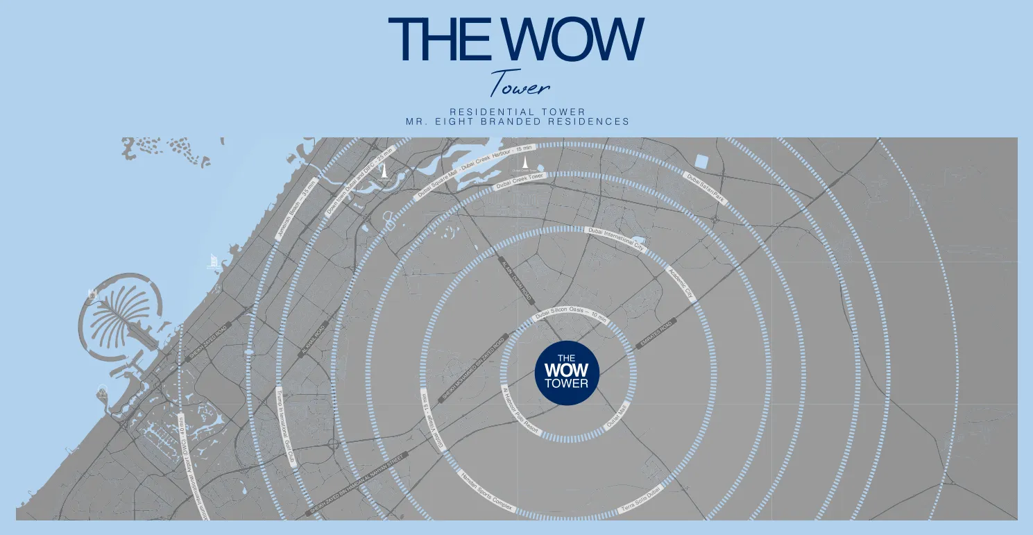 The WOW Tower is a landmark high-rise located in Dubai Land Residence Complex (DLRC), within the broader Dubailand district. As the tallest and most distinctive residential address in the area, it is poised to become an iconic addition to the skyline — a new vertical destination defined by bold architecture, contemporary character, and elevated standards of living.