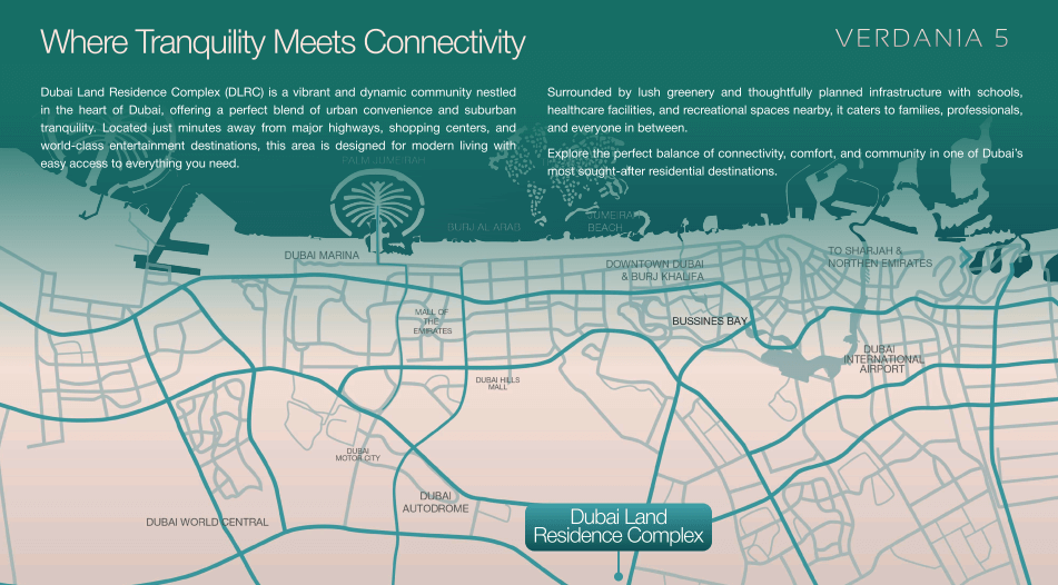 Dubai Land Residence Complex is strategically located just minutes away from major highways such as Al Ain Road (E66) and Emirates Road (E611), and key destinations across Dubai, residents can enjoy swift access to Downtown Dubai, Dubai International Airport, and other iconic landmarks.