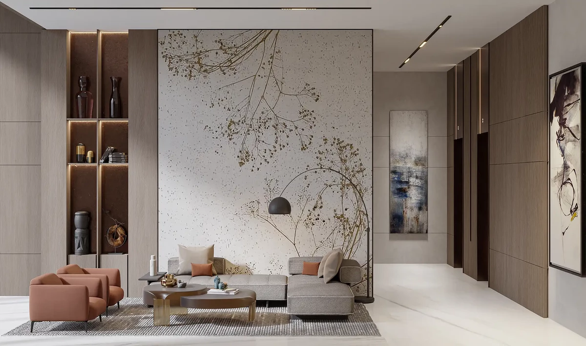 The interior design embodies a minimalistic contemporary style that places a strong emphasis on creating an ambiance of warmth, harnessing abundant natural light, and showcasing clean lines. It also showcases uniquely refined aesthetics and exquisite architectural details. The color palette draws inspiration from the natural world, featuring soothing shades of beige, grey, brown, and tan.