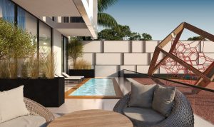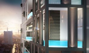 The exterior structure lends the building an industrial grid-style aesthetic by utilizing steel as the primary material for a robust framework. Simultaneously, the presence of the pool element enhances the overall tactile smoothness.